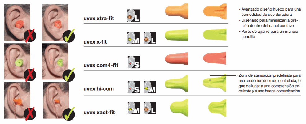 Lo mejor siempre es probarse dos tamaños. UVEX ofrece una gama completa en tres tamaños y con los modelos com4-fit y x-fit consiguen cubrir la mayoría de canales auditivos.