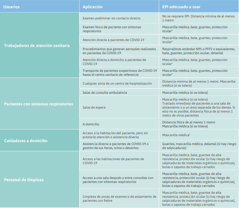 El tipo adecuado de EPI a utilizar variará en función del riesgo de exposición, del entorno, del tipo de personal y de la actividad desarrollada. En el siguiente cuadro, basado en las directrices de la OMS, se indica el equipo de protección individual adecuado para cada usuario en diversas aplicaciones.
