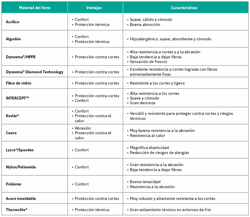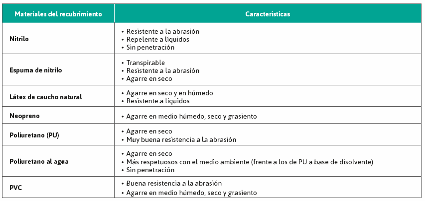 A continuación encontrarás las ventajas y características de la mayoría de materiales que se utilizan en los recubrimientos y forros de los guantes, además de los puntos positivos y negativos de los diferentes materiales utilizados para protegerte contra productos químicos y líquidos.