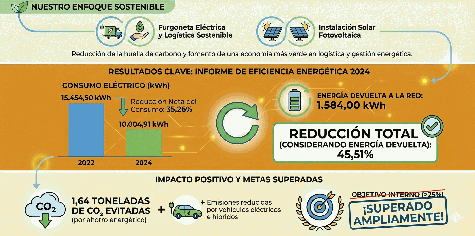 Los resultados son claros: según nuestro Informe de Eficiencia Energética 2024, hemos logrado una reducción neta del consumo eléctrico del 35,26% respecto a 2022, que asciende al 45,51% si consideramos la energía devuelta a la red.